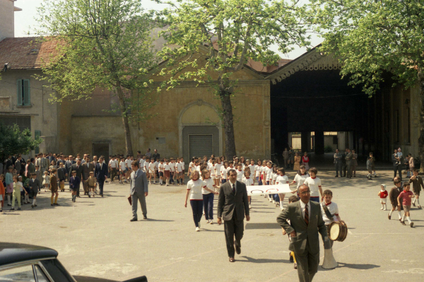 Descrizione: I ragazzi partecipanti alla 1^ edizione dei Giochi della Gioventù entrano nel cortile dell'oratorio con la bandiera olimpica, accompagnati dal rullo dei tamburi.